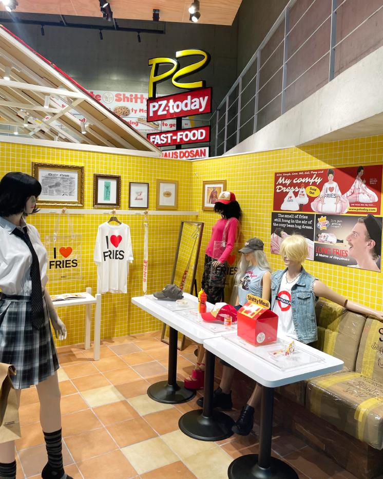 이름만큼이나 유니크한 세계관을 가진 그녀의 이번 팝업 스토어는 PZ today의 Fries 작업의 연장선으로 PZ의 어린 시절 패스트 푸드점에서 생일 파티를 하던 기억들을 재치있게 담아 'PZToday Fast-food Restaurant' 콘셉트로 진행된다.