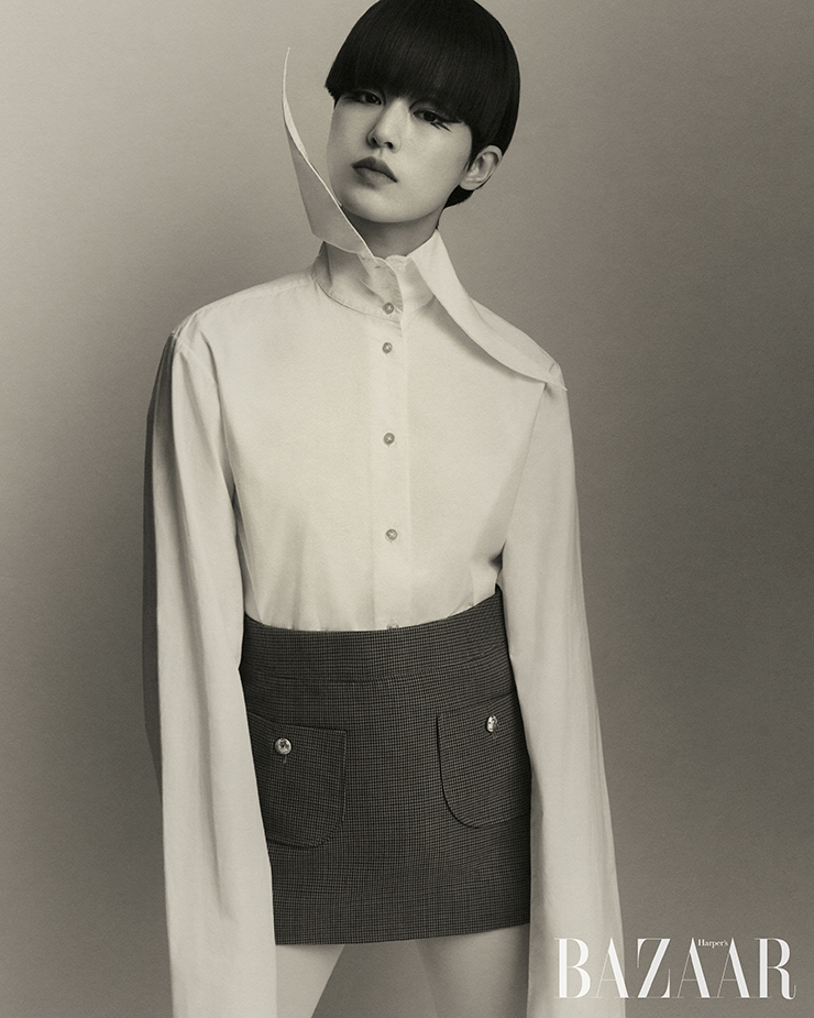 셔츠는 85만원 Ponder.er by Empty. 도트 패턴 타이는 Thom Browne. 오른쪽 귀에 착용한 귀고리는 에디터 소장품.