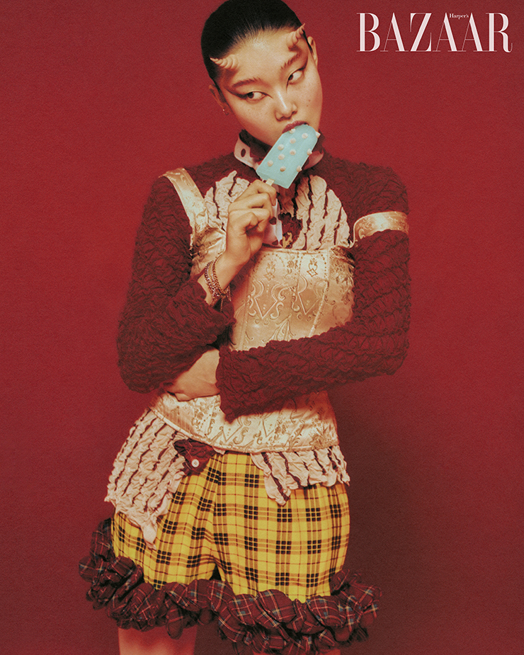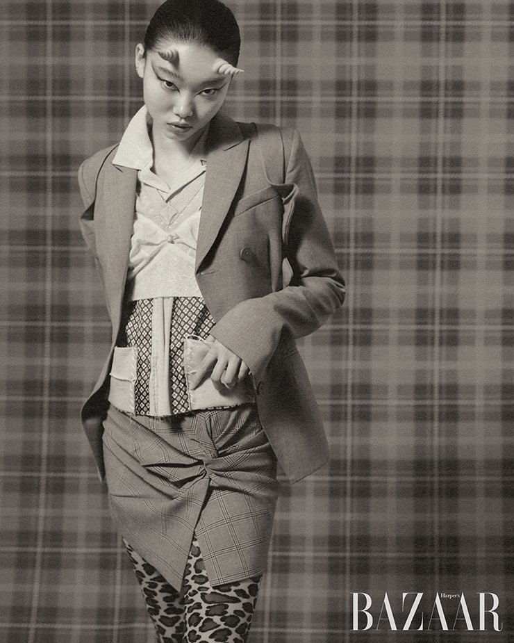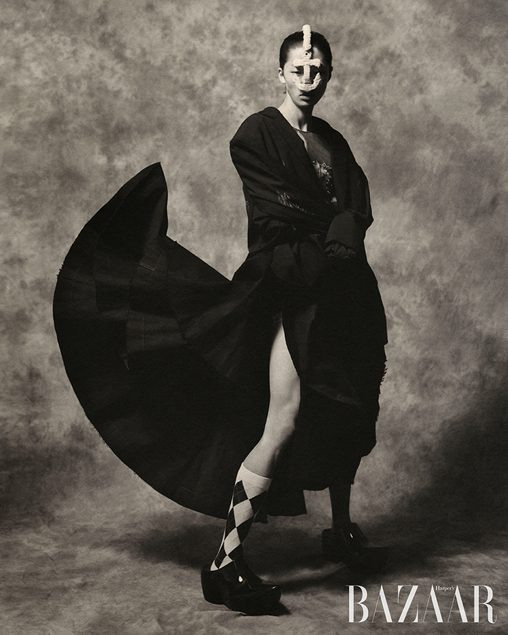 스커트는 Sportmax. 헤드 피스는 Thom Browne. 아가일 패턴 양말은 에디터 소장품.