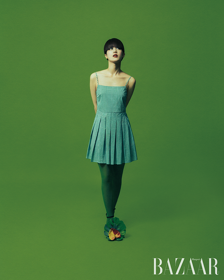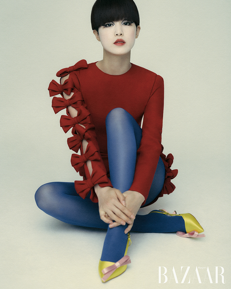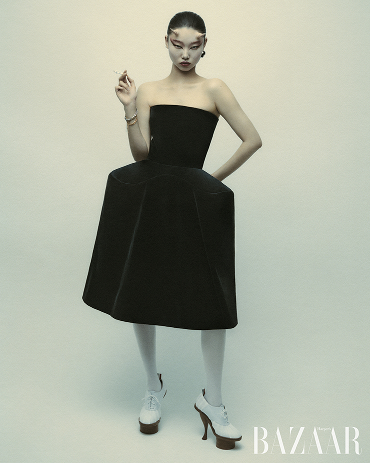 플랫폼 슈즈는 Thom Browne. 오른쪽 귀에 착용한 귀고리, 타이츠는 에디터 소장품.