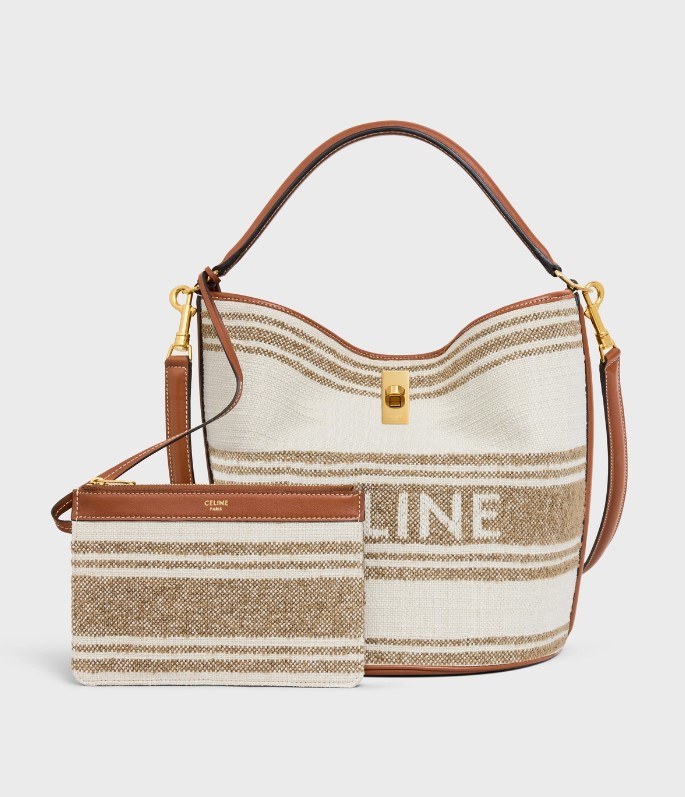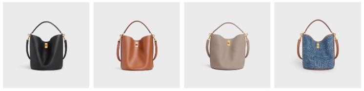 텍스타일과 카프스킨 마감으로 여름백으로 시원하게 들기 좋은 버킷 백이다. 핸드백, 숄더백, 클로스 바디백으로 착용 가능하며 내부의 지퍼 파우치와 가죽 스크랩은 탈부착이 가능하다. 여름 휴가룩을 좀더 센스있게 만들어 줄 셀린느 버킷 16백은 블랙, 브라운(탠), 데님 블루, 진한 베이지(페블)로도 구성되어 있다. 23 X 25 X 23cm