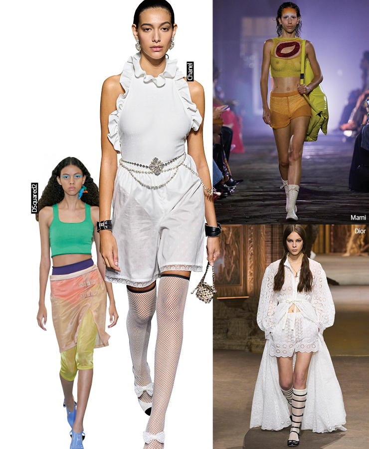 속을 훤히 드러내는 시스루가 섹시하다고만 생각했는가. 이번 시즌 시스루 쇼츠는 펀칭 장식과 레이스 트리밍, 파스텔 컬러로 재탄생하며 러블리한 매력을 더했다. 샤넬은 러플 홀터넥 스윔수트에 레이스 트리밍 쇼츠를 더했으며, 디올은 꽃 모티프를 섬세하게 펀칭하거나 속이 훤히 비치는 소재에 프린트해 목가적 낭만을 담았다. 마르니는 니트를 성글게 짜 언더웨어를 보여주면서도 옐로, 오렌지 등 채도 높은 컬러로 발랄함을 잃지 않았다. 시스루는 레이어드할 수 있는 아이템도 무궁무진하다. 디스퀘어드2와 포스터 걸(Poster Girl)처럼 시스루 쇼츠 위에 스커트, 보디수트를 스타일링하는 팁을 기억하자.