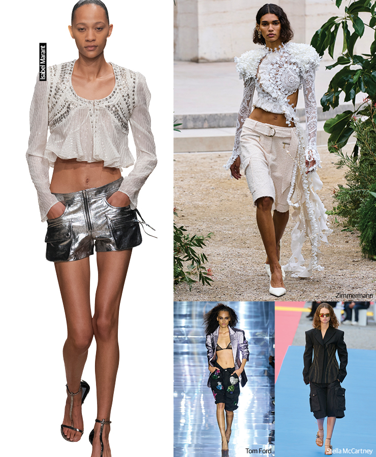 카고 팬츠가 Y2K 트렌드에 힙입어 인기가 사그라지지 않는 가운데, 이제 새로운 무드에 도전할 필요가 있다. 포멀하거나 페미닌한 아이템과 매치해 차분하게 연출해보는 것. 이자벨 마랑은 크롭트 블라우스, 러플 브라 톱에 짧은 카고 쇼츠를 더했으며, 스텔라 매카트니는 어깨 각이 잡힌 재킷과 카고 쇼츠를 올 블랙 세트업으로 디자인해 세련미를 발산했다. 톰 포드는 버뮤다 실루엣 쇼츠에 반짝이는 패치를 마구 붙여 글램 룩을 구현했고, 짐머만은 질감이 고급스러운 아이보리색 쇼츠를 꼬리가 긴 레이스 블라우스와 스타일링해 우아한 분위기를 배가했다.