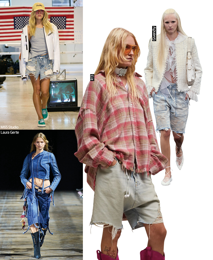 청바지(jeans)와 반바지(shorts)의 합성어로 데님 반바지를 일컫는 ‘조츠’. 이미 2013년 옥스퍼드 사전에 등록된 신조어인데 10년이 넘은 지금 또다시 조짐이 심상치 않다. 지난해 틱톡에서 입지 않는 데님 팬츠를 러프하게 잘라 입는 챌린지 영상이 유행했는데, 더불어 쿨한 조츠 차림으로 뉴욕에 모습을 드러낸 벨라 하디드의 사진 한 장이 조츠 인기에 불을 지폈다. 조츠는 버뮤다 팬츠, 카고 팬츠와는 미묘하게 다르다. 무릎 기장의 낙낙한 실루엣, 대충 자른 듯 투박하면서도 빈티지한 무드가 특징. 지방시는 트위드 재킷과 매치해 우아한 분위기를 자아냈고, R13은 그런지한 오버사이즈 셔츠와 롱 부츠를 더해 인디슬리즈 스타일을 제안했다. 라우라 게르테(Laura Gerte)는 로 라이즈 조츠로 Y2K 스타일을 완성했다.