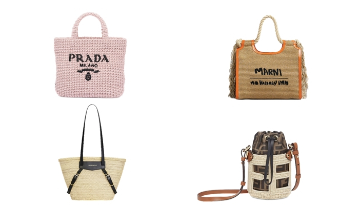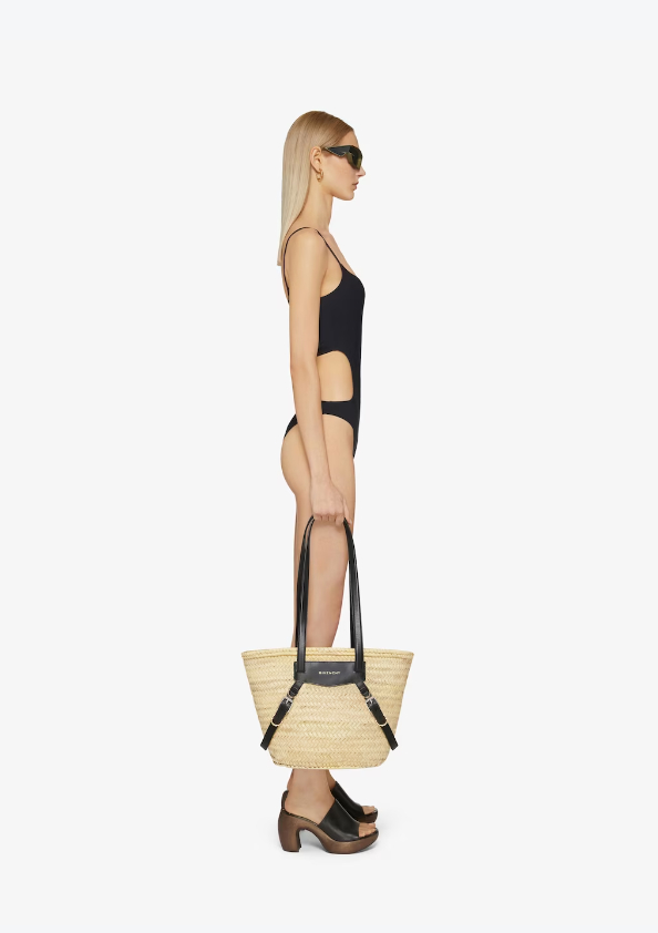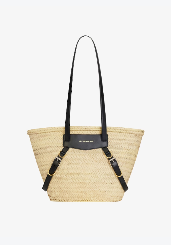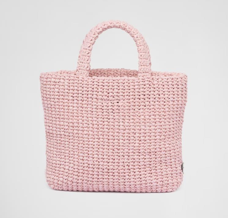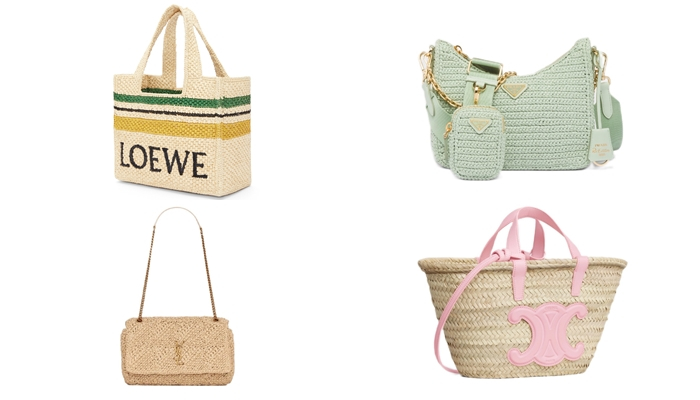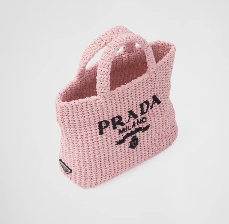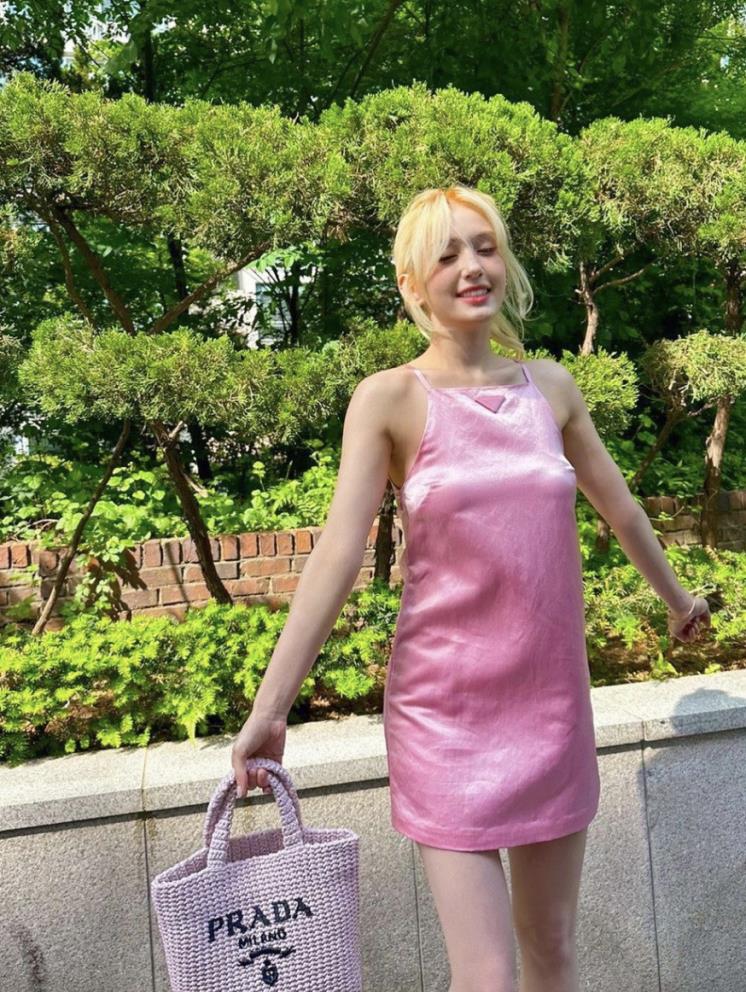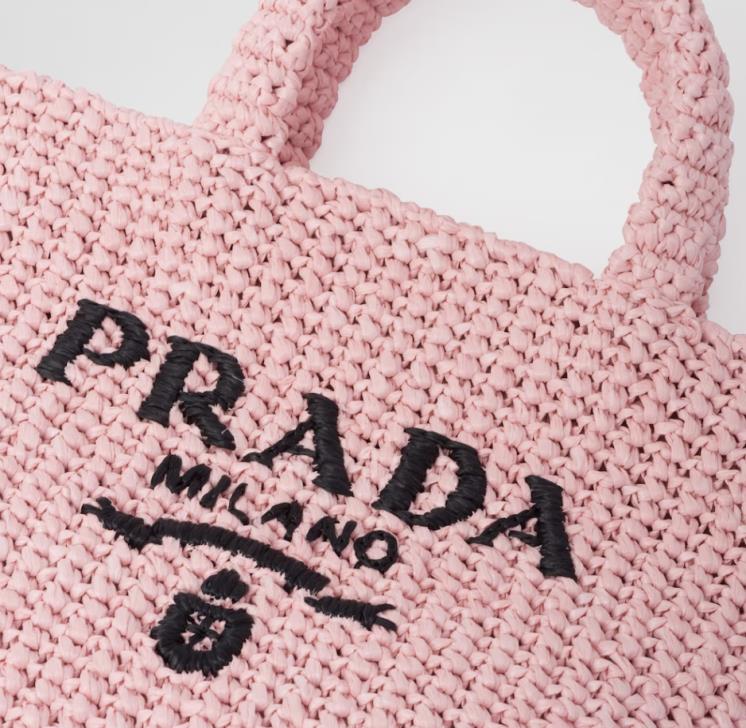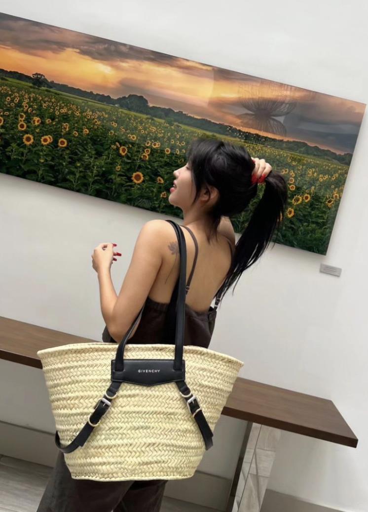 핑크 컬러 슬립 드레스에 여름 분위기의 가벼운 천연 소재인 라피아 소재 토트백을 톤온톤 컬러 매치해 러블리하면서도 청량한 무드를 완성한 전소미. 가볍고 편안한게 들 수 있는 가방으로 데일리로 들기 제격! 자수 레터링 로고가 앞부분에 크게 새겨져 있고 상징적인 에나멜 메탈 트라이앵글 로고 측면을 장식했다.