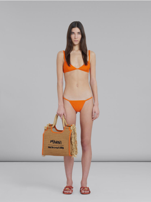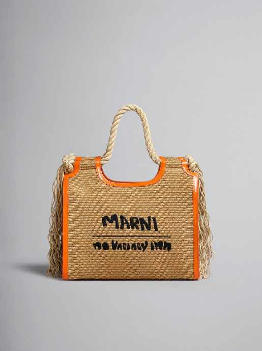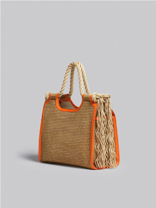 경쾌한 오렌지 컬러가 포인트 된 라피아 소재의 토트백. 트와이스 지효는 베이지 컬러 롱 셔츠에 화이트 팬츠와 함께 매치해 시우너하면서도 멋스러운 섬머룩을 연출했다. 밧줄 모양으로 되어있는 손잡이가 캐주얼하면서도 자유로운 무드를 담아내기도.