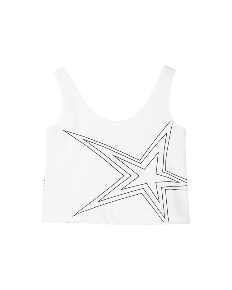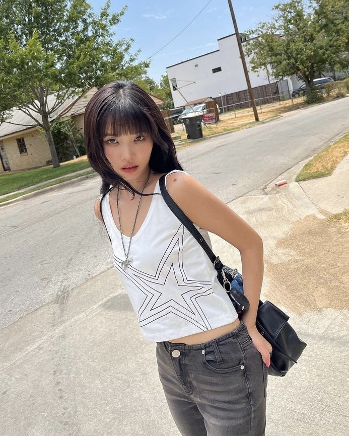 전소연은 별 프린팅이 존재감을 뽐내는 슬리브리스 티셔츠를 착용했다. 넉넉한 핏의 크롭트 기장으로 꾸안꾸 룩을 완성할 수 있다. 컬러는 화이트와 블랙 두 가지 중 선택 가능!