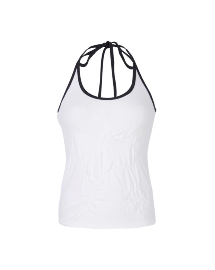 은은하게 새겨진 플라워 자수와 배색 스트링이 시선을 사로잡는 노윤서의 톱. 뒷면에는 홀터넥 디자인으로 시원하게 착용할 수 있고 뒷면에 브랜드 로고 펜던트가 유니크함을 더한다.