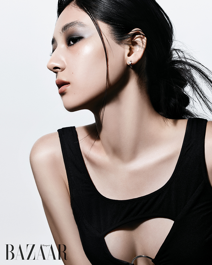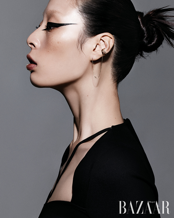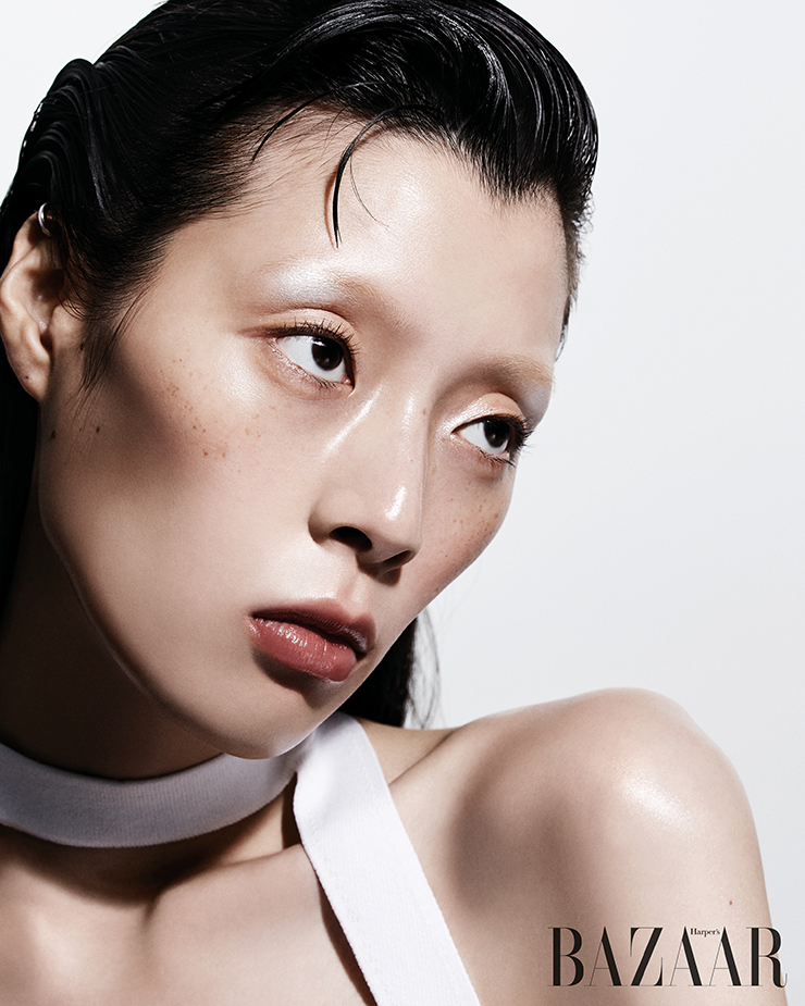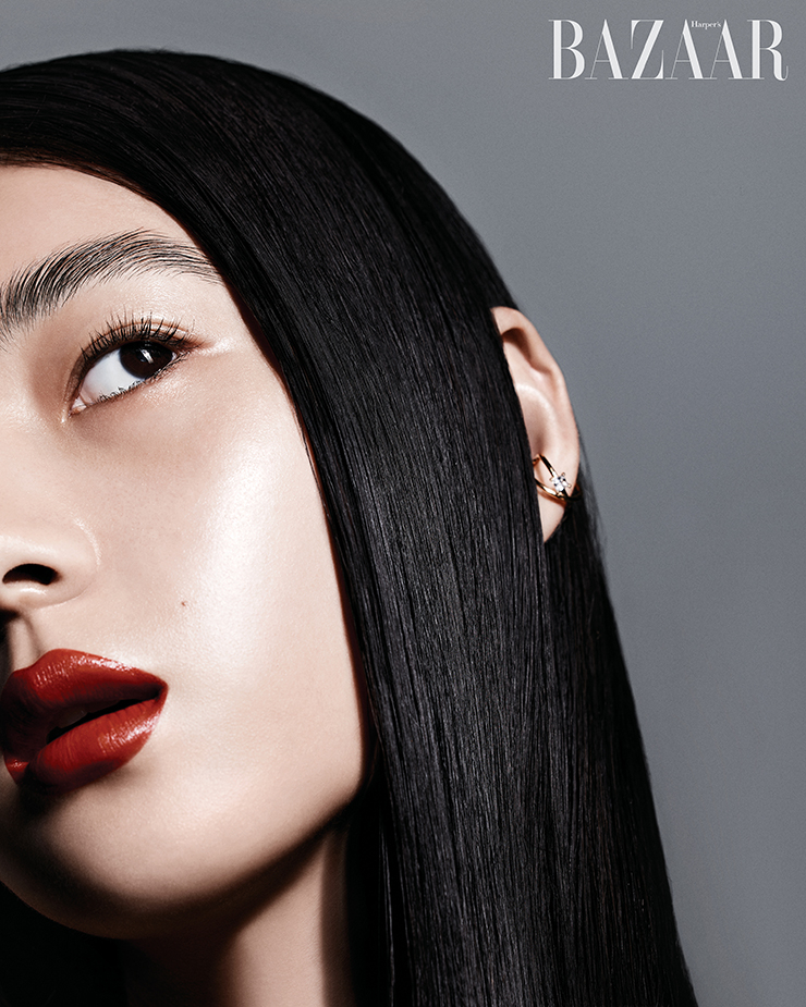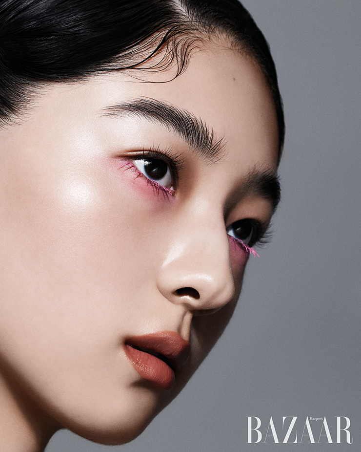 민낯처럼 보이는 슈퍼 내추럴 베이스는 이번 시즌에도 유효하다. 달라진 점은 아무것도 바르지 않은 듯한 무심한 얼굴 위에 하이라이터가 더해진 것. 애니메이션 <세일러문>에서 영감받아 달빛 어린 눈가를 연출한 샌디 리앙 쇼 메이크업은 당장 시도하고 싶을 정도. 화보의 모델 역시 글로하게 베이스를 완성하고 눈썹과 아이홀에 실버 포인트를 가미했다. 파우더와 밤 타입 하이라이터를 섞어 바르면 피부에 자연스럽게 녹아든 반짝임을 표현할 수 있다.
