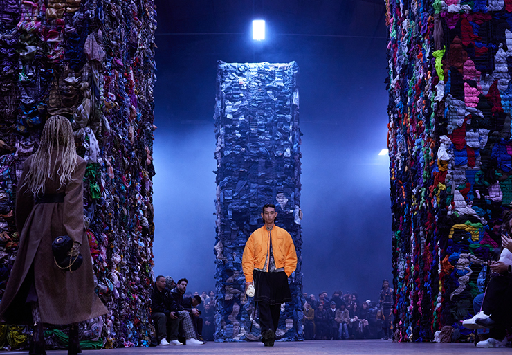 스카프, 토트백, 그리고 데님으로 만든 8미터 높이의 데드 스톡 타워. 2023 F/W 마린 세르의 런웨이에는 재사용 소재로 세워진 세 개의 타워가 위용을 드러냈다. 지속가능성에 남다른 책임감을 지닌 디자이너 마린 세르는 이번에도 50%의 룩을 업사이클 소재로, 나머지 절반은 생분해성 원사와 재활용 직물을 사용해 완성했다. 또한 세 개의 타워는 그녀가 선보일 컬렉션의 장엄한 예고편과도 같았는데 그도 그럴 것이 토트백, 데님, 스카프 조각으로 만든 룩들이 차례로 런웨이에 등장했기 때문.
