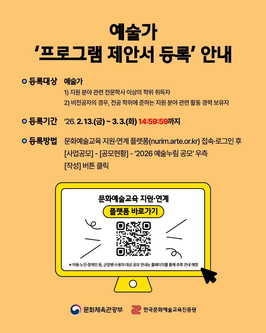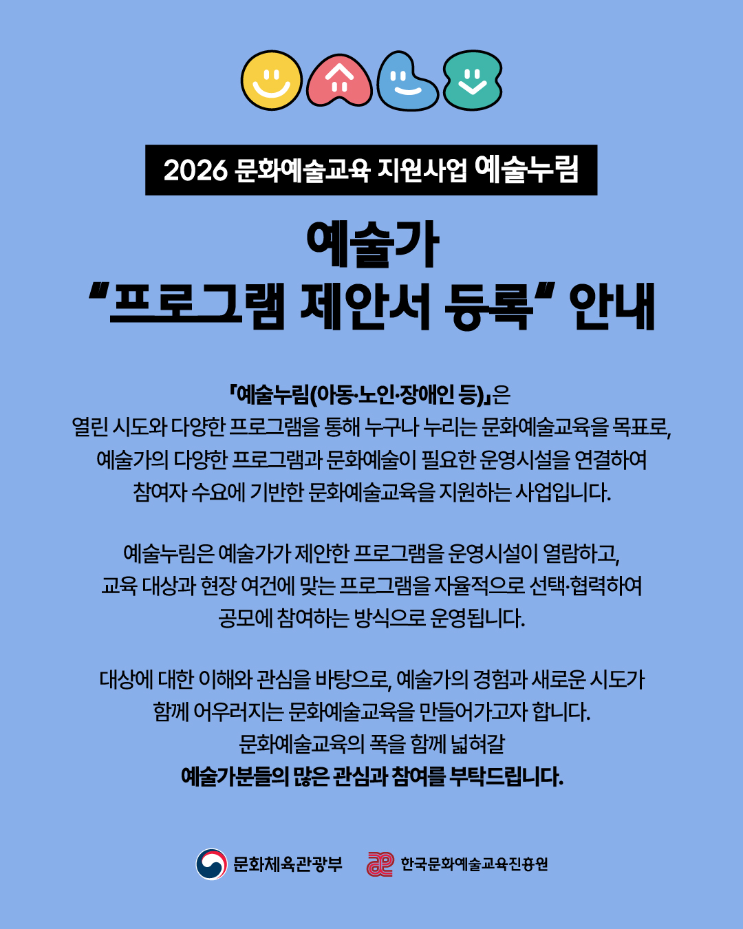 [한국문화예술교육진흥원] 2026 문화예술교육 지원사업 예술누림 [예술가 프로그램 제안서 등록] 안내