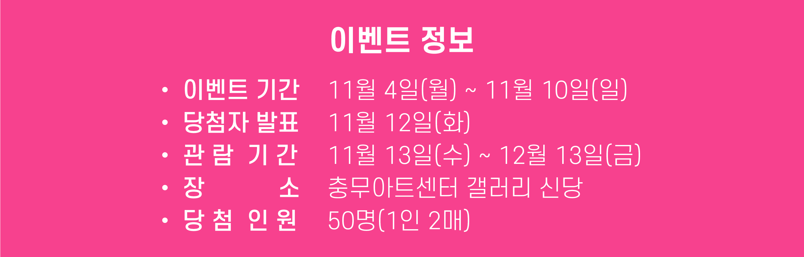 우리들의 문화생활이 보다 풍요로워지기를 바라는 마음으로, 전시 / 문화 / 예술과 관련된 유용한 정보와 경험을 자유롭게 공유해요.