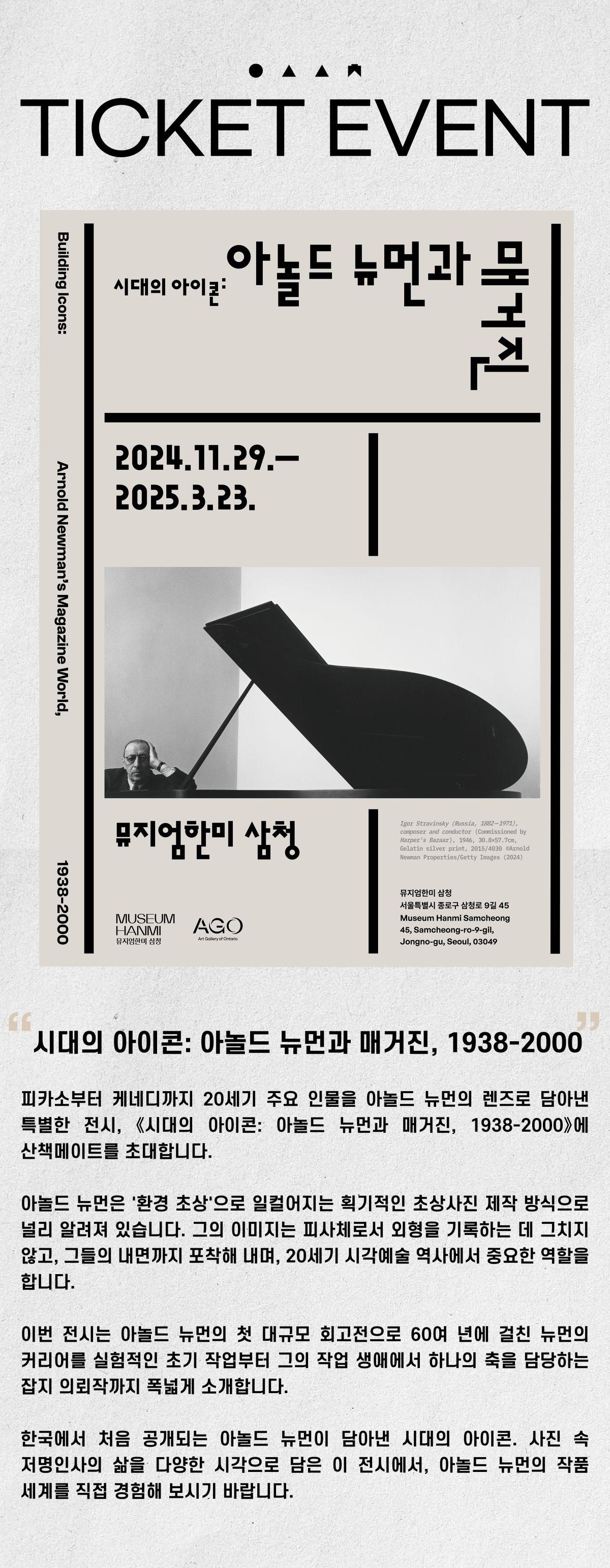 참여완료!! 뮤지엄 한미 꼭 가보고 싶었어요. 아놀드 뉴먼 사진 스트라빈스키 사진을 보고 꼭 그의 시진전을 보고싶었어요!!! 예술산책 인스타 팔로우, 커뮤니티 댓글 전부 완료했습니다♡