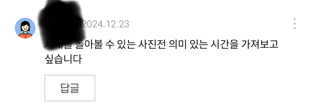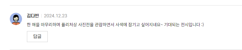 미션완료!^♡^ 평소 사진에 대해서 가장 큰 관심이있고 무엇보다도 이번 전시에 그 어느때 보다도 더 큰 관심과 기대가 가득합니다~!!! 2024년 올 한 해를 마무리 하면서 제가 가장 보고싶고 또 가장 기대하는 전시를 예술산책을 통해서 보게된다면 그 어느때보다 가장 큰 기억으로 남아서 무척이나 뜻깊고 잊을 수 없을것 같습니다~!! 그럼 꼭 부탁드려볼께요~ 메리 메리 크리스마스~~*^___^*