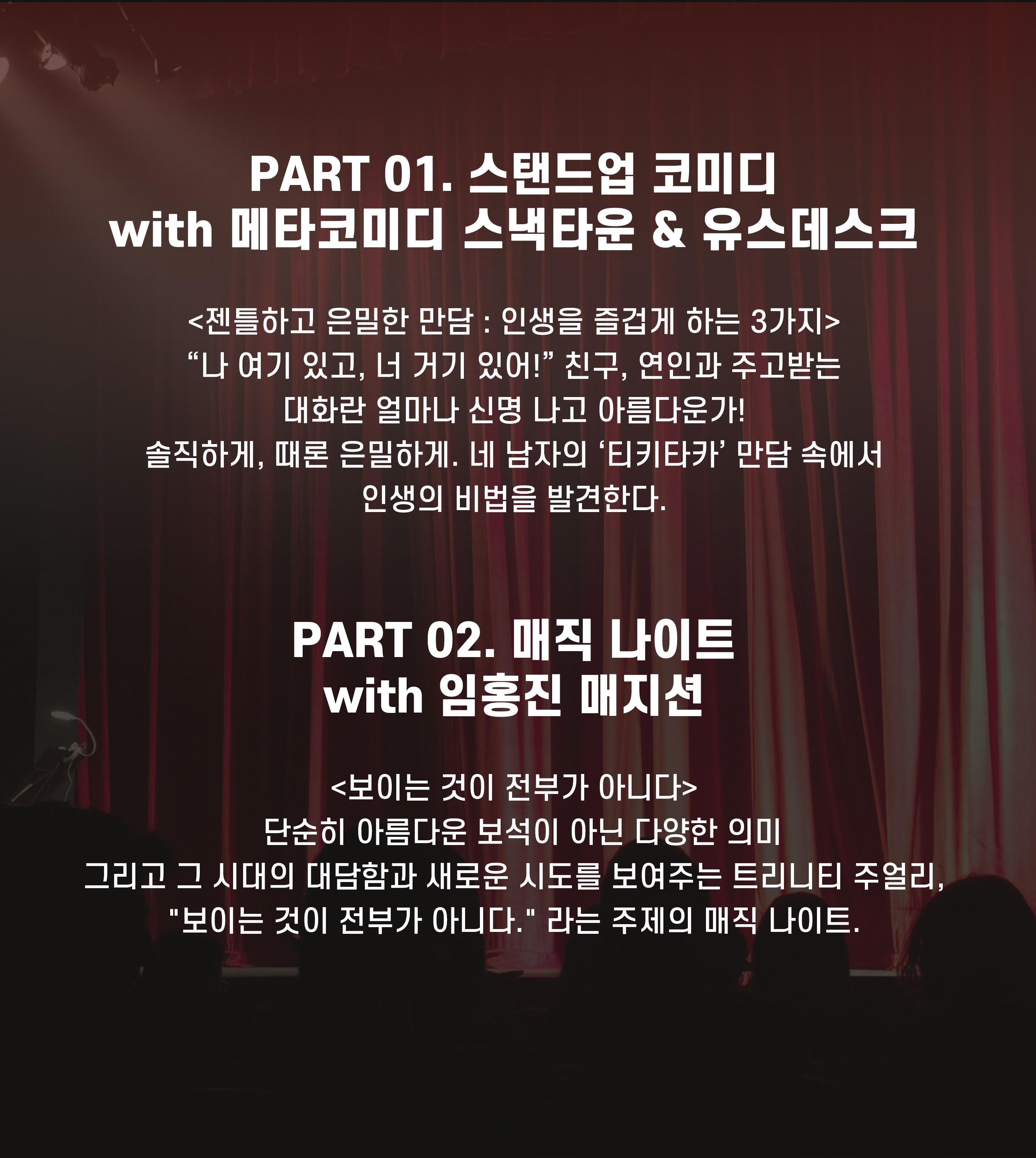 퇴근 후 불목에 즐기는 매직 나이트와 까르띠에가 준비한 스탠드업 코미디는, 그 무엇보다도 넘넘 재밌을 것 같고 소중한 기억으로 남을 것 같아 기대됩니다💜!!!
