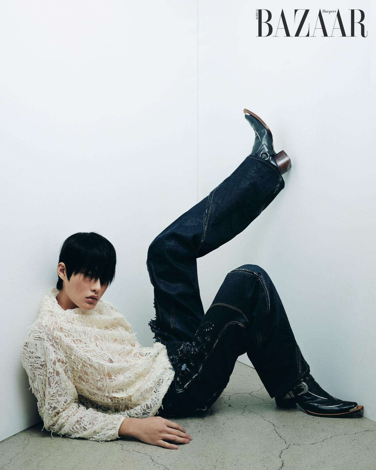 레이스 후드 톱, 플라워 펀칭 디테일 팬츠, 버클 장식 부츠는 모두 Juntae Kim.