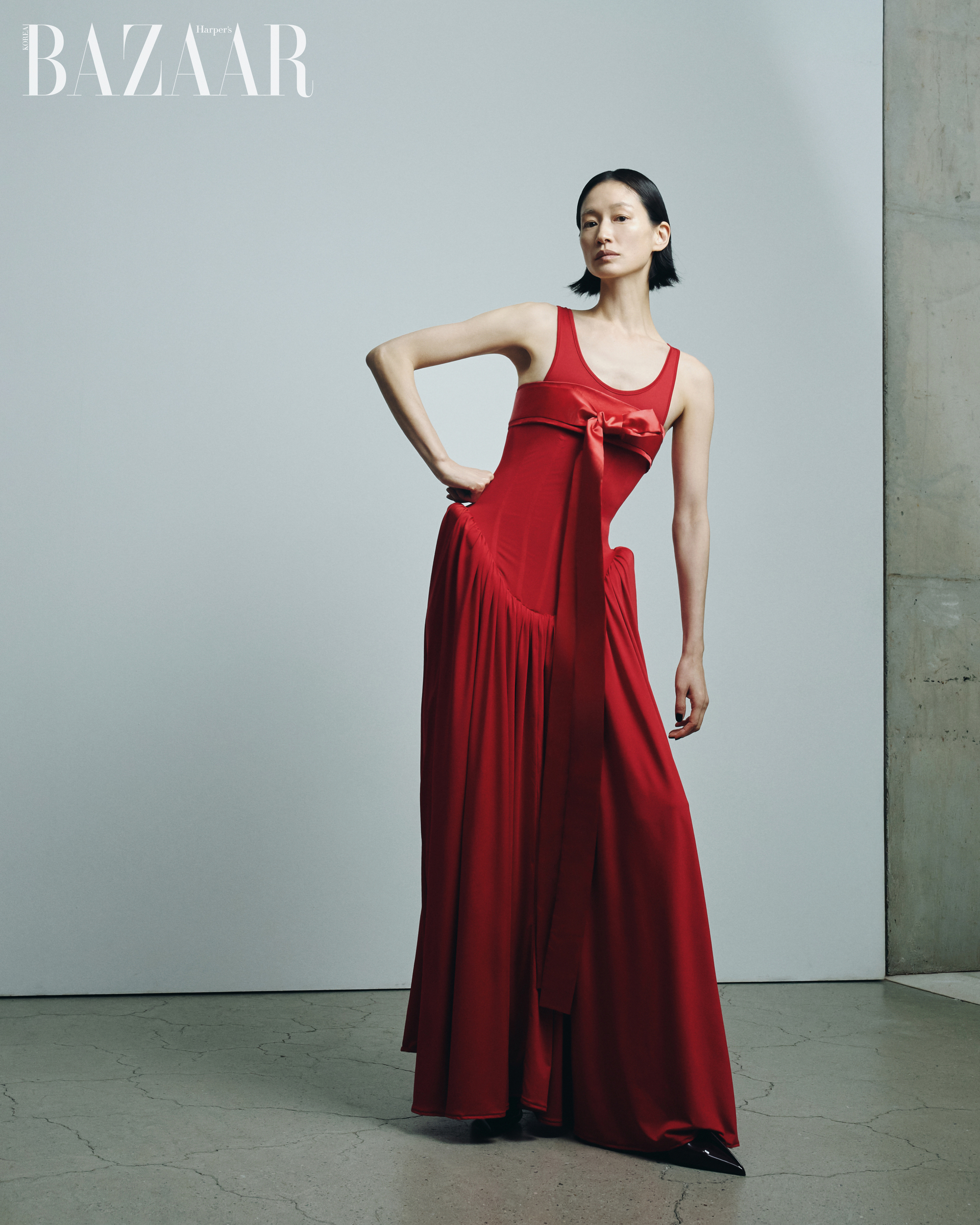 전통 한복 고름에서 영감받은 드레스, 포인티드 토 뮬은 Leje.