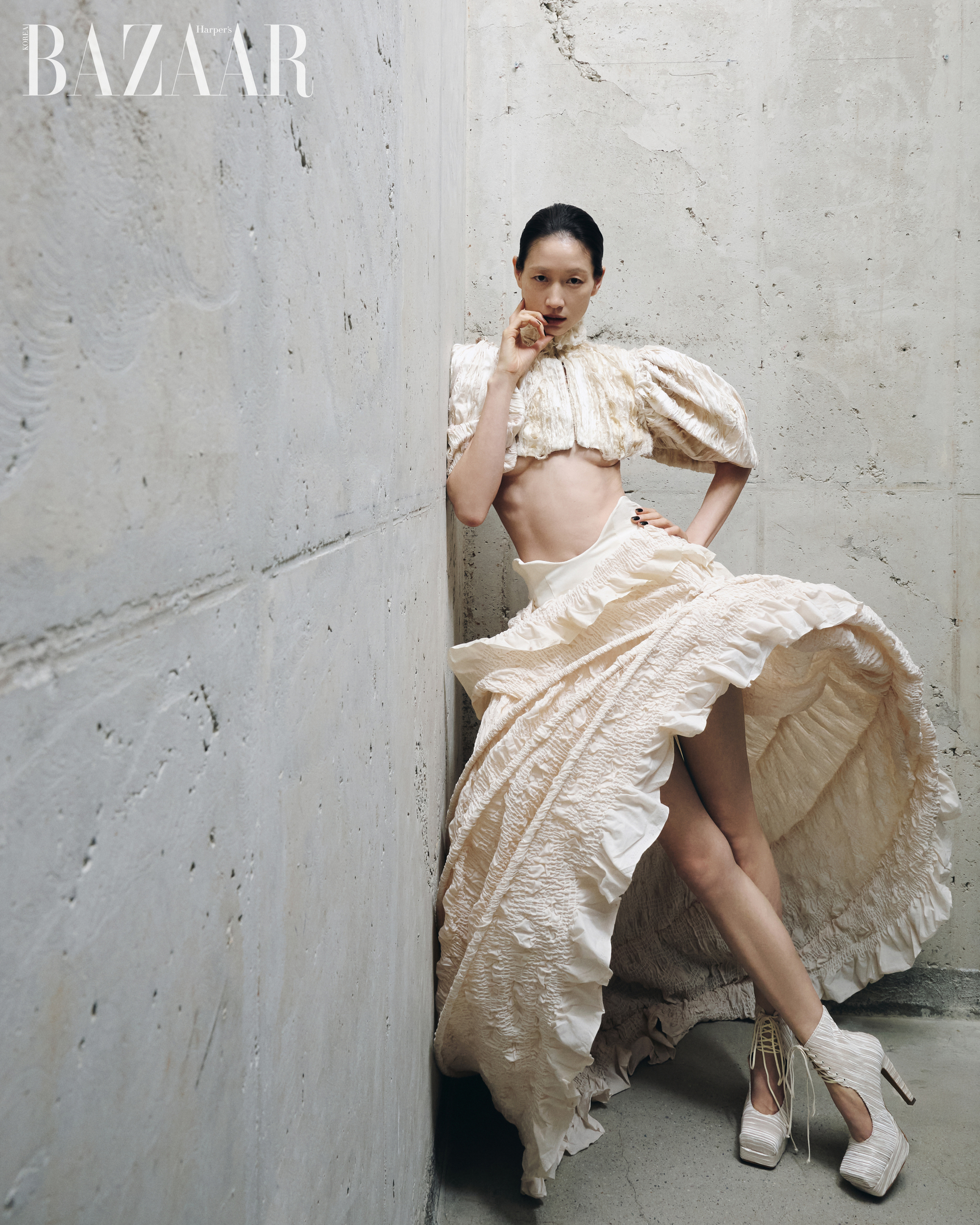 크롭트 톱, 언발란스 크리놀린 스커트, 플랫폼 힐은 모두 Gyouree Kim.